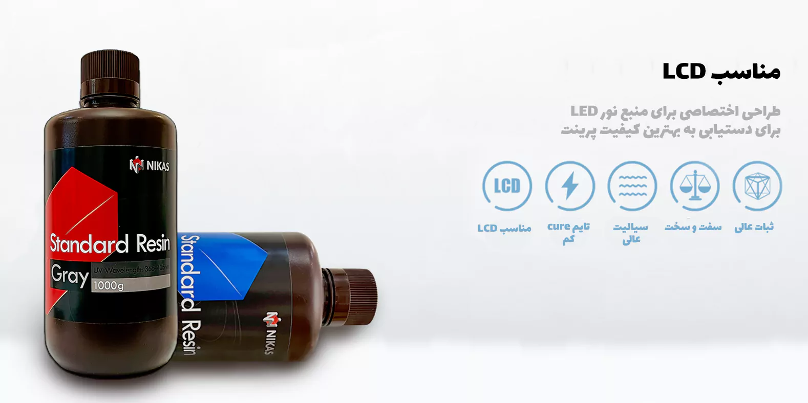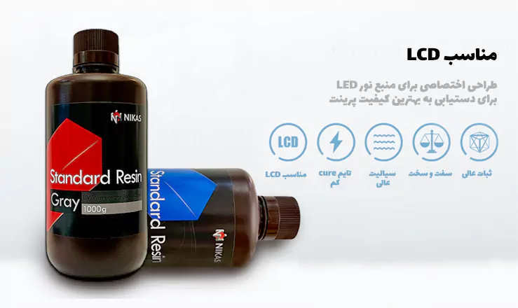 رزین مدلسازی Nikas توسط شرکت انیکیوبیک بطور اختصاصی برای پرینتر های رزینی با منبع نور LED با توان پایین طراحی شده است و به همین علت لایه ها با دریافت میزان کمتری نور UV نسبت به رزین های پرینتر های SLA و DLP خشک می شوند و قطعه تولید می شود.